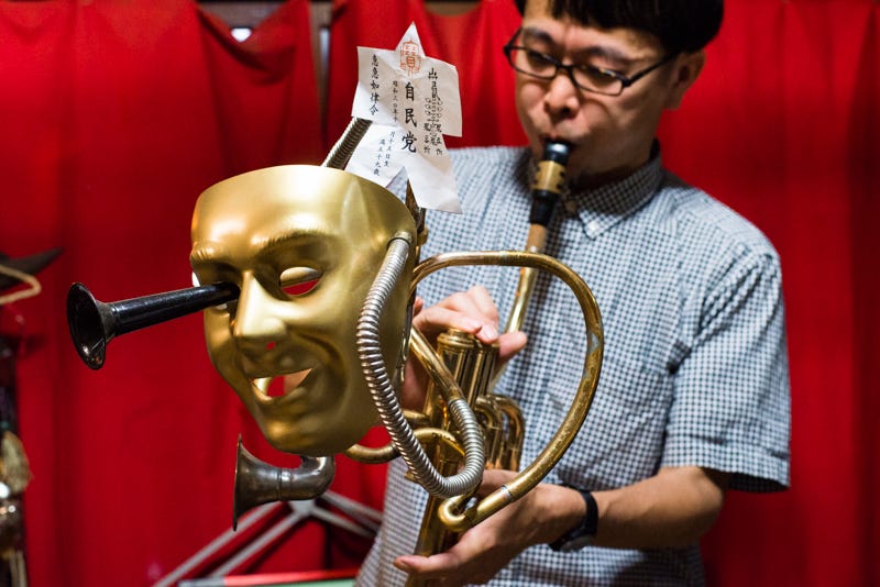 Protesters march through the streets of Tokyo every weekend to demand the prime minister's head on a pike. The crowd chants, "Curse you, Abe!" But one man means it literally. Oda Masanori, better known by his activist moniker Illcommonz, infuses social disobedience with witchcraft learned from an East African shaman during field work in the early 90s. His recent exhibit of home-made disobedient objects at Irregular Rhythm Asylum, an anarchist bookstore in Shinjuku, culminated on September 21st with a jazz concert to wish Abe the worst on his birthday.