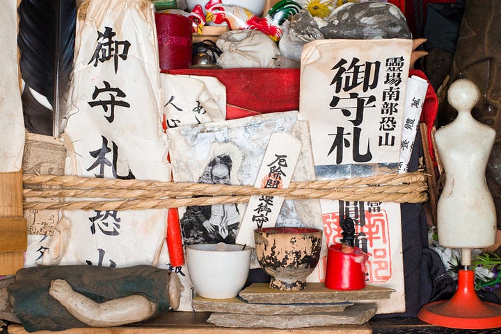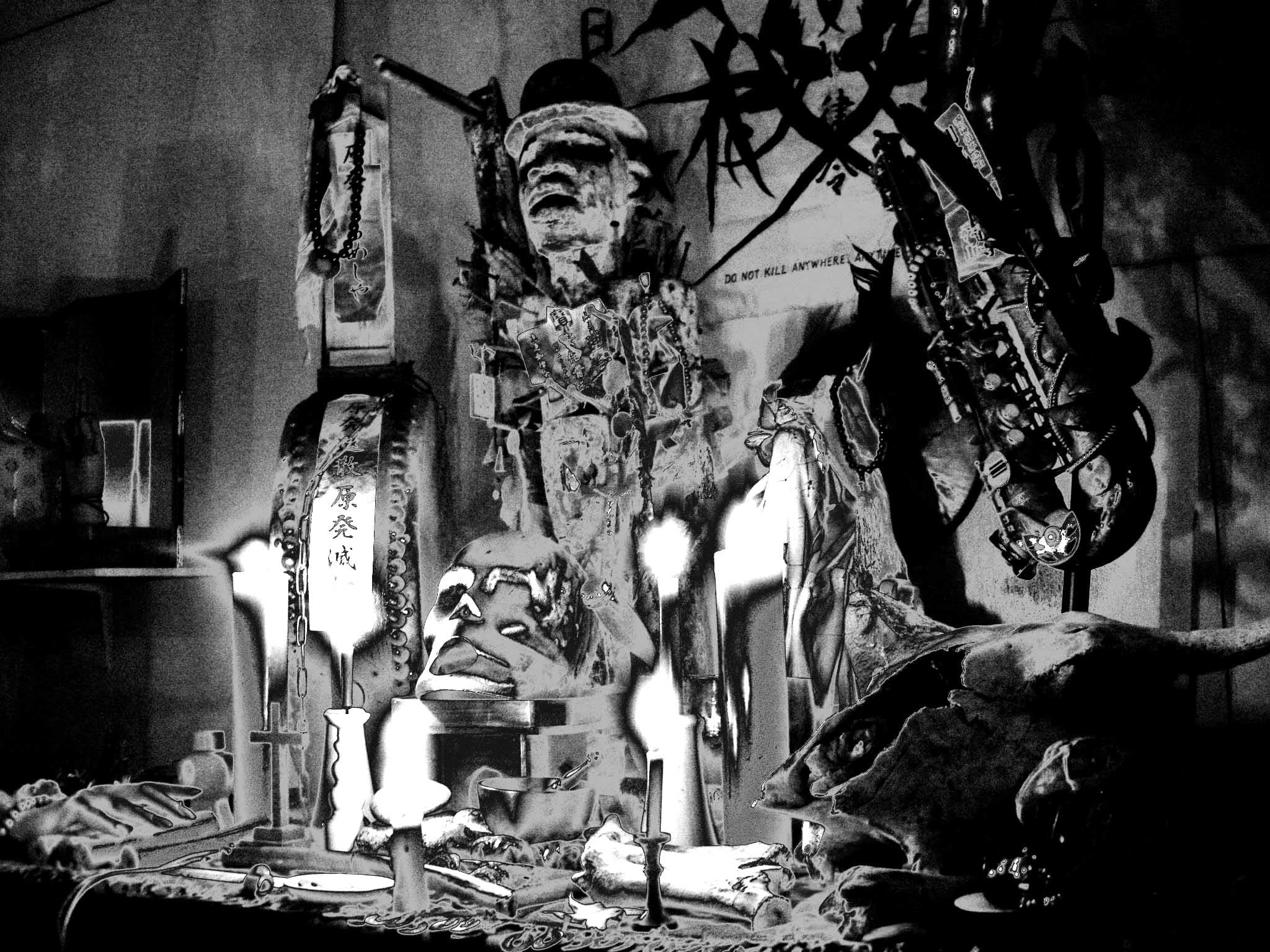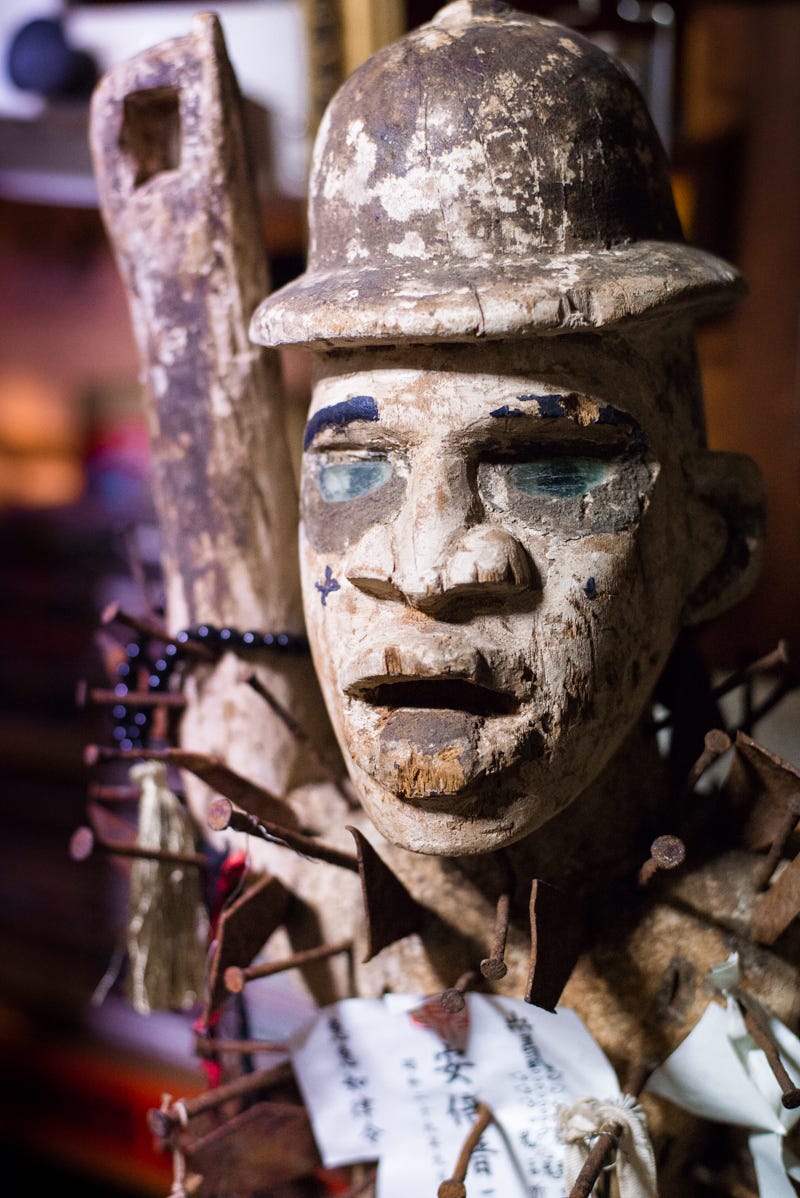 Off the top of my head I can say the exhibit contains elements from Christianity, Islam, Taoism, Buddhism, Shinto, Hinduism and indigenous African beliefs. I picked up the wooden effigy in Zaire and the hitogata paper charm nailed to it is from Shinto. They both protect against thieves like Abe who’d steal our democracy.